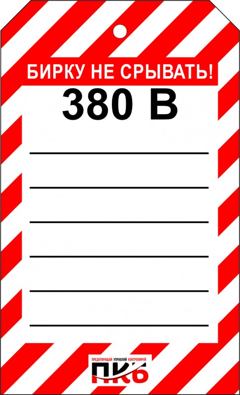 Информационная бирка "Напряжение 380В", арт. PKBS95, односторонняя. Изготовлена из пластика, без ламинации, толщиной 0,3 мм, без люверса, Ø отверстия 7 мм. По желании заказчика толщина бирки может быть увеличена до 1-2 мм. Нанесение текста можно производить маркером или ручкой. Размер 70 х 115 х 0,3мм.